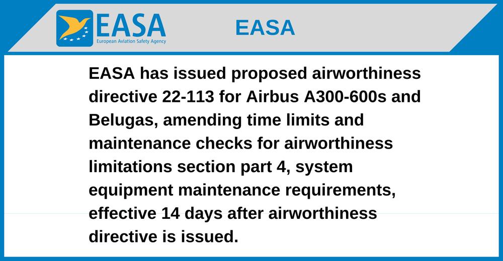 EASA has issued proposed airworthiness directive 22-113 for Airbus A300-600s and Belugas, amending time limits and maintenance checks for airworthiness limitations section part 4, system equipment maintenance requirements, effective 14 days after airworthiness directive is issued.