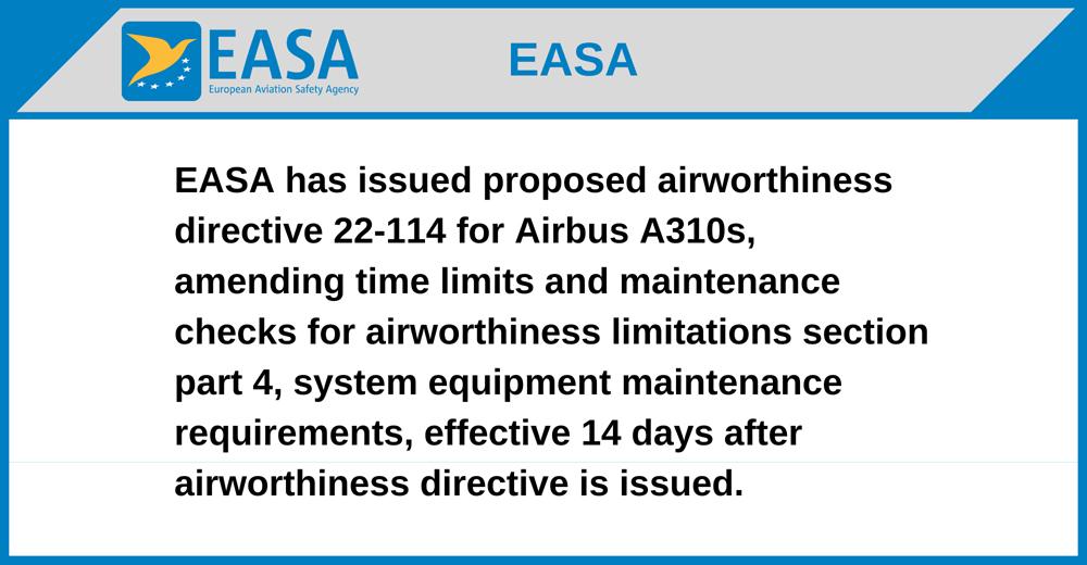 EASA has issued proposed airworthiness directive 22-114 for Airbus A310s, amending time limits and maintenance checks for airworthiness limitations section part 4, system equipment maintenance requirements, effective 14 days after airworthiness directive is issued.