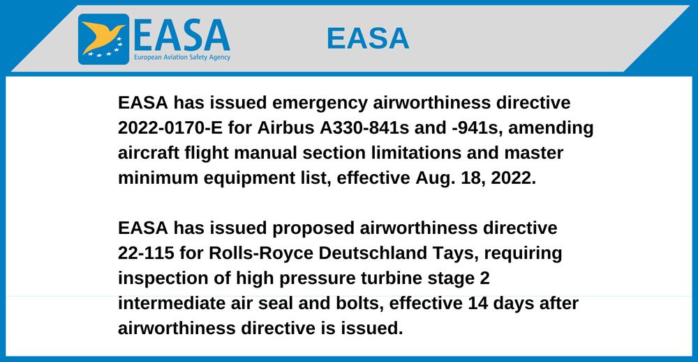 EASA has issued emergency airworthiness directive 2022-0170-E for Airbus A330-841s and -941s, amending aircraft flight manual section limitations and master minimum equipment list, effective Aug. 18, 2022.