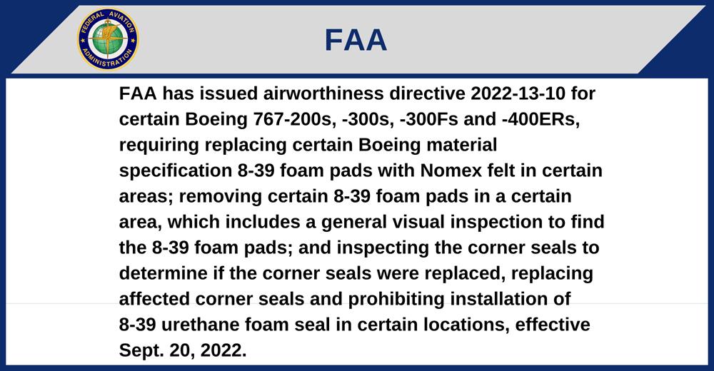 FAA has issued airworthiness directive 2022-13-10 for certain Boeing 767-200s, -300s, -300Fs and -400ERs, requiring replacing certain Boeing material specification 8-39 foam pads with Nomex felt in certain areas; removing certain 8-39 foam pads in a certain area, which includes a general visual inspection to find the 8-39 foam pads; and inspecting the corner seals to determine if the corner seals were replaced, replacing affected corner seals and prohibiting installation of 8-39 urethane foam seal in certain locations, effective Sept. 20, 2022.