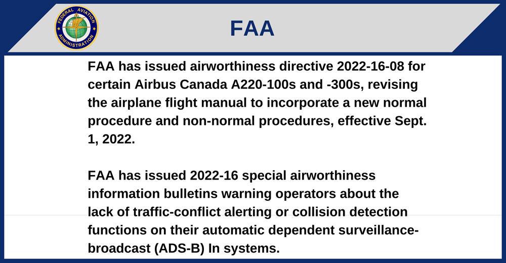 FAA has issued airworthiness directive 2022-16-08 for certain Airbus Canada A220-100s and -300s, revising the airplane flight manual to incorporate a new normal procedure and non-normal procedures, effective Sept. 1, 2022.