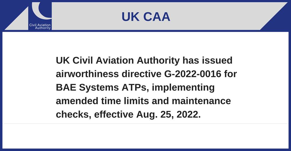 UK Civil Aviation Authority has issued airworthiness directive G-2022-0016 for BAE Systems ATPs, implementing amended time limits and maintenance checks, effective Aug. 25, 2022.