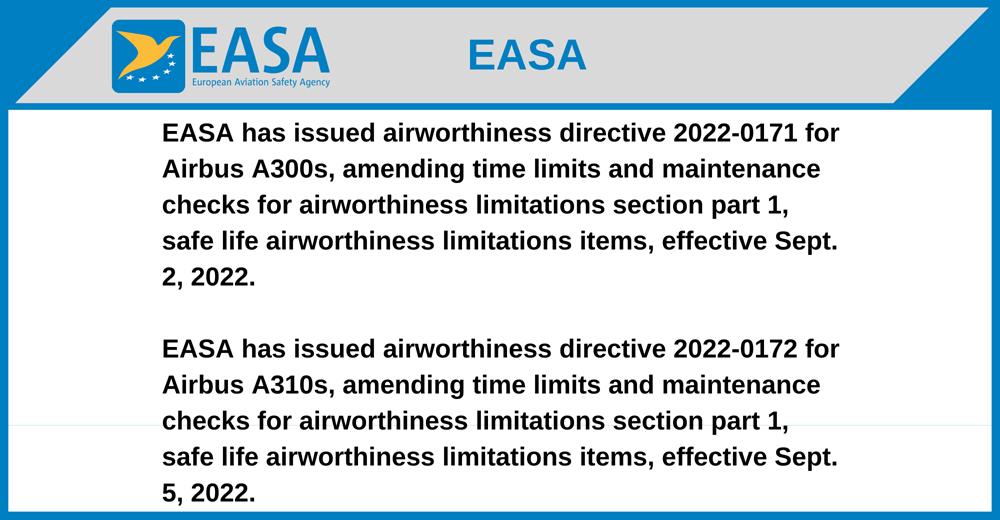 EASA has issued airworthiness directive 2022-0171 for Airbus A300s, amending time limits and maintenance checks for airworthiness limitations section part 1, safe life airworthiness limitations items, effective Sept. 2, 2022.