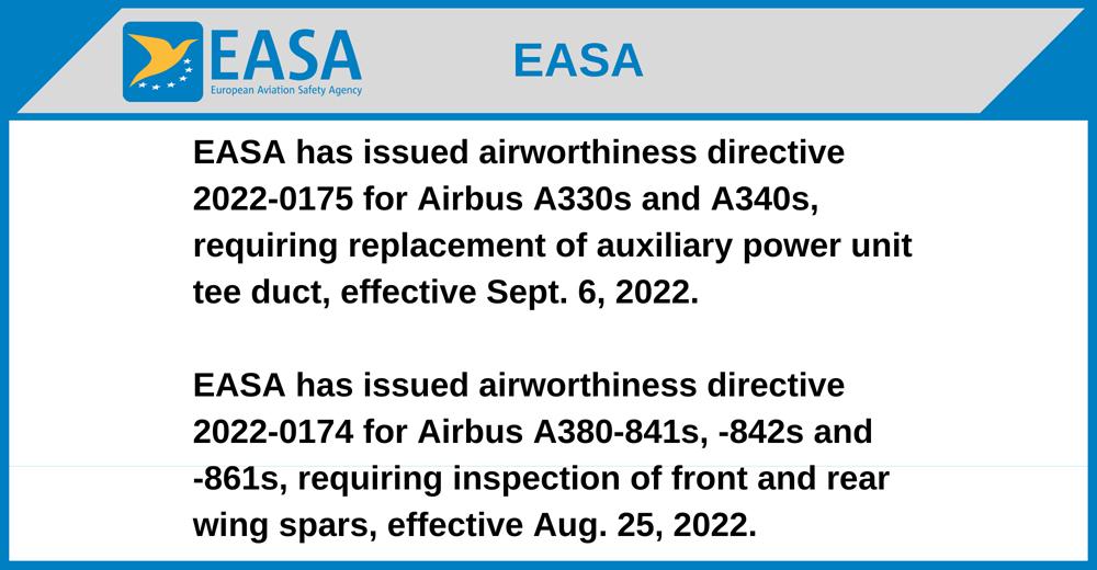 EASA has issued airworthiness directive 2022-0175 for Airbus A330s and A340s, requiring replacement of auxiliary power unit tee duct, effective Sept. 6, 2022.
