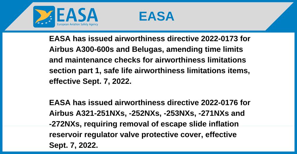 EASA has issued airworthiness directive 2022-0173 for Airbus A300-600s and Belugas, amending time limits and maintenance checks for airworthiness limitations section part 1, safe life airworthiness limitations items, effective Sept. 7, 2022.