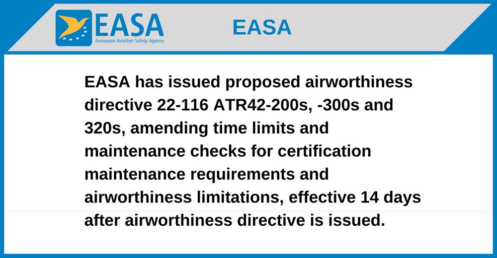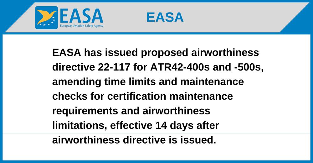 EASA has issued proposed airworthiness directive 22-117 for ATR42-400s and -500s, amending time limits and maintenance checks for certification maintenance requirements and airworthiness limitations, effective 14 days after airworthiness directive is issued.
