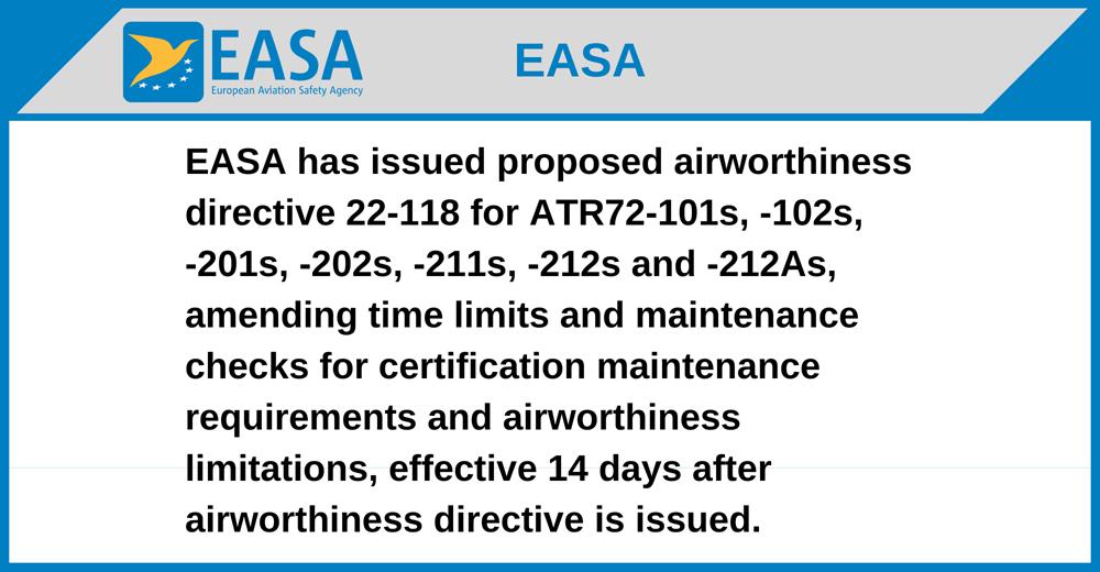 EASA has issued proposed airworthiness directive 22-118 for ATR72-101s, -102s, -201s, -202s, -211s, -212s and -212As, amending time limits and maintenance checks for certification maintenance requirements and airworthiness limitations, effective 14 days after airworthiness directive is issued.