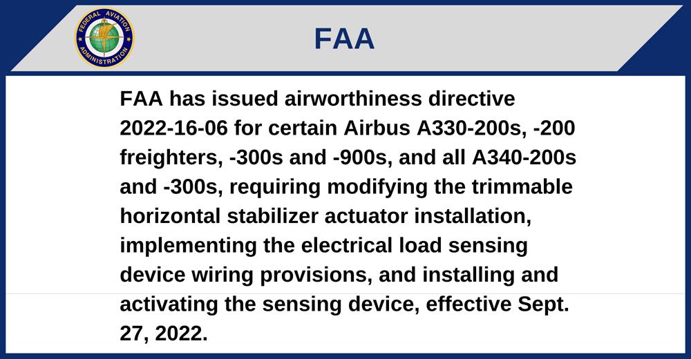 FAA has issued airworthiness directive 2022-16-06 for certain Airbus A330-200s, -200 freighters, -300s and -900s, and all A340-200s and -300s, requiring modifying the trimmable horizontal stabilizer actuator installation, implementing the electrical load sensing device wiring provisions, and installing and activating the sensing device, effective Sept. 27, 2022.
