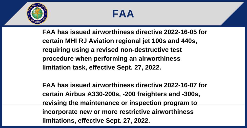 FAA has issued airworthiness directive 2022-16-05 for certain MHI RJ Aviation regional jet 100s and 440s, requiring using a revised non-destructive test procedure when performing an airworthiness limitation task, effective Sept. 27, 2022.