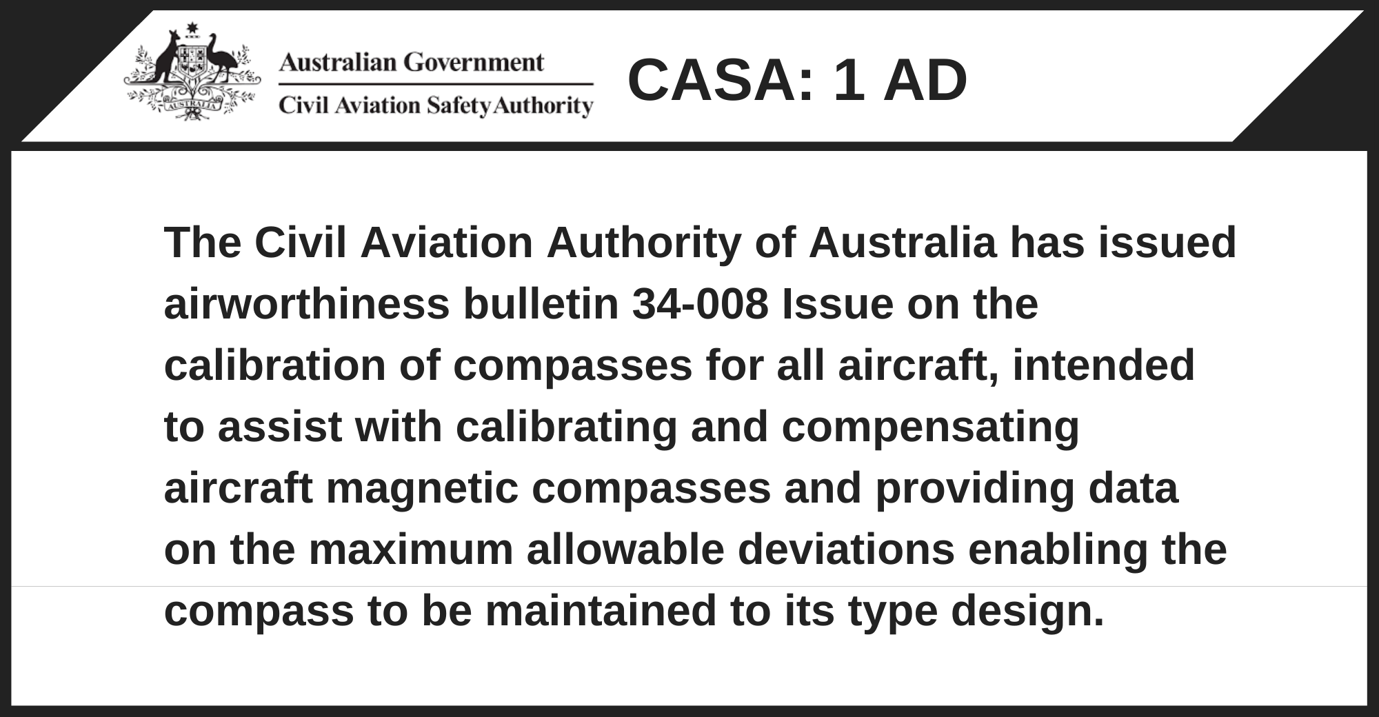The Civil Aviation Authority of Australia has issued airworthiness bulletin 34-008 Issue on the calibration of compasses for all aircraft, intended to assist with calibrating and compensating aircraft magnetic compasses and providing data on the maximum allowable deviations enabling the compass to be maintained to its type design.