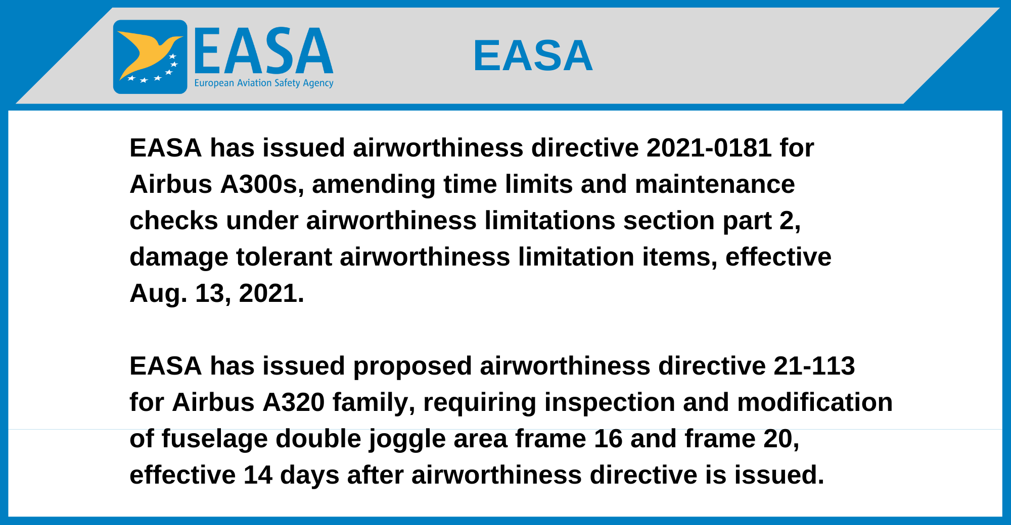 EASA has issued proposed airworthiness directive 21-113 for Airbus A320 family, requiring inspection and modification of fuselage double joggle area frame 16 and frame 20, effective 14 days after airworthiness directive is issued.