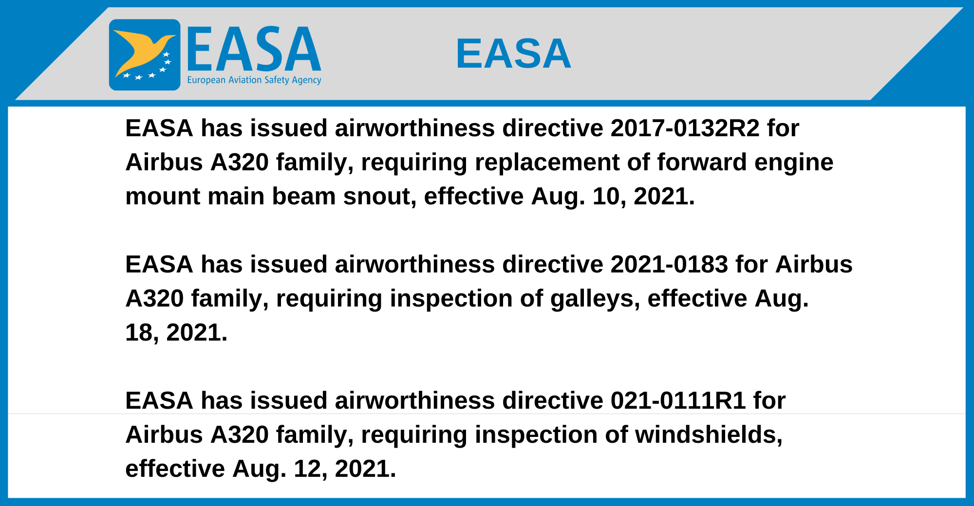 EASA has issued airworthiness directive 021-0111R1 for Airbus A320 family, requiring inspection of windshields, effective Aug. 12, 2021.