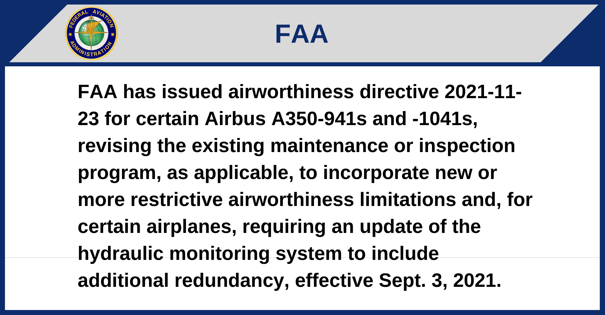 FAA has issued airworthiness directive 2021-13-06 for certain Airbus A350-941s and -1041s, revising the existing maintenance or inspection program, as applicable, to incorporate new or more restrictive airworthiness limitations, effective Sept. 3, 2021.
