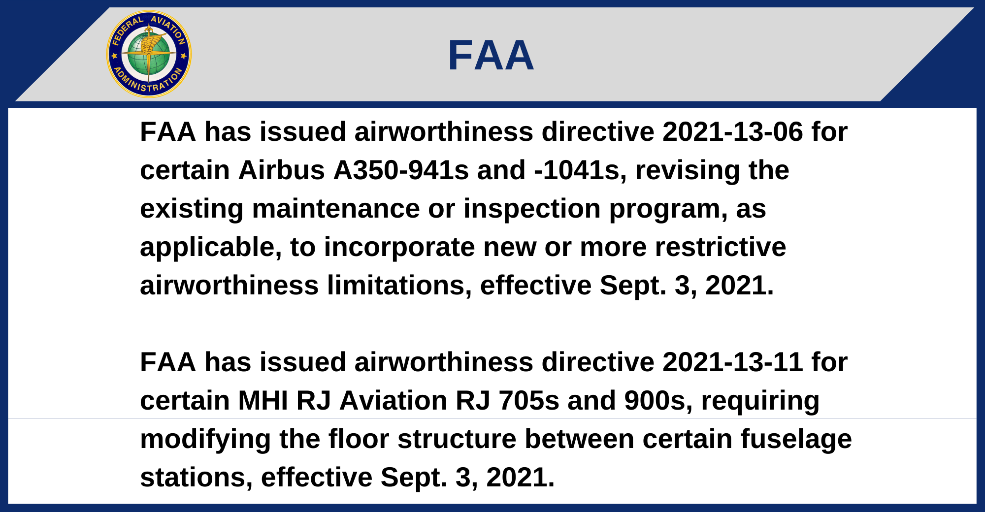 FAA has issued airworthiness directive 2021-13-11 for certain MHI RJ Aviation RJ 705s and 900s, requiring modifying the floor structure between certain fuselage stations, effective Sept. 3, 2021.