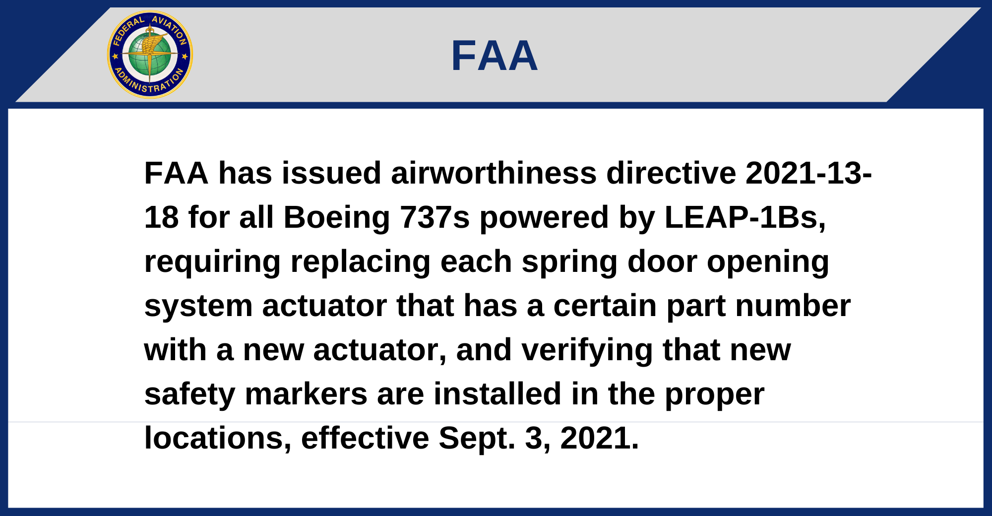 FAA has issued airworthiness directive 2021-13-18 for all Boeing 737s powered by LEAP-1Bs, requiring replacing each spring door opening system actuator that has a certain part number with a new actuator, and verifying that new safety markers are installed in the proper locations, effective Sept. 3, 2021.