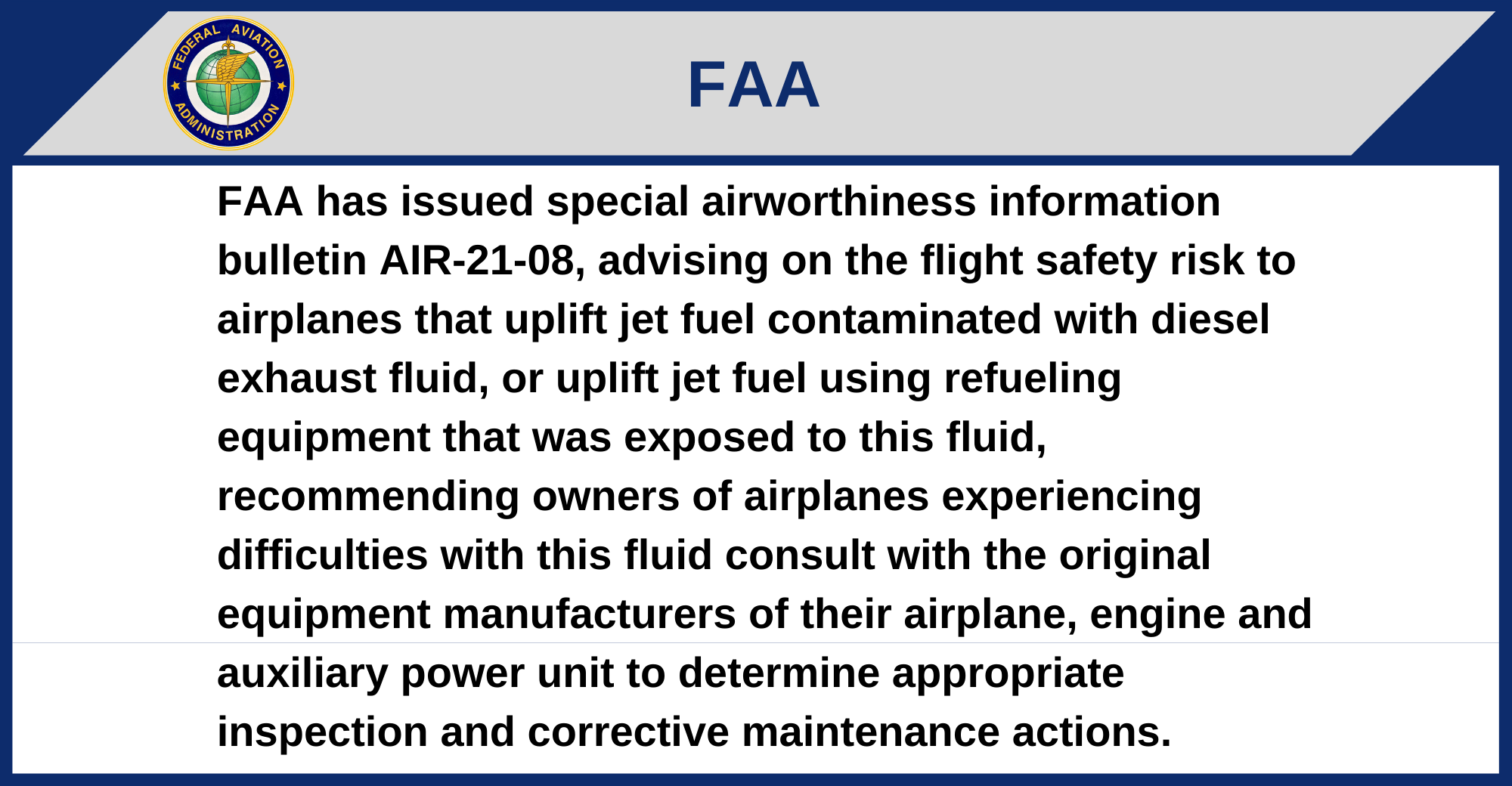 FAA has issued special airworthiness information bulletin AIR-21-08, advising on the flight safety risk to airplanes that uplift jet fuel contaminated with diesel exhaust fluid, or uplift jet fuel using refueling equipment that was exposed to this fluid, recommending owners of airplanes experiencing difficulties with this fluid consult with the original equipment manufacturers of their airplane, engine and auxiliary power unit to determine appropriate inspection and corrective maintenance actions.