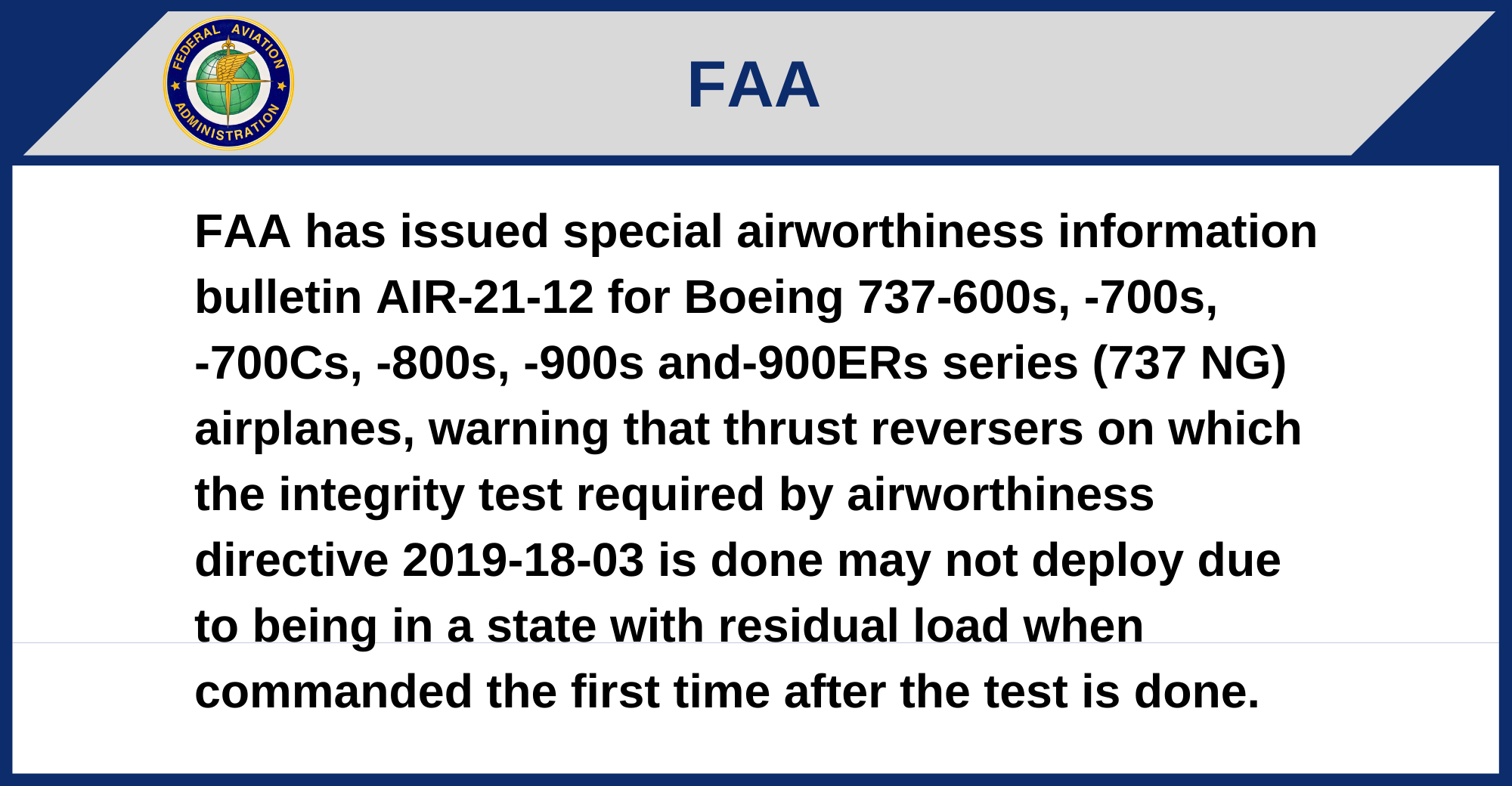 FAA has issued special airworthiness information bulletin AIR-21-12 for Boeing 737-600s, -700s, -700Cs, -800s, -900s and-900ERs series (737 NG) airplanes, warning that thrust reversers on which the integrity test required by airworthiness directive 2019-18-03 is done may not deploy due to being in a state with residual load when commanded the first time after the test is done.