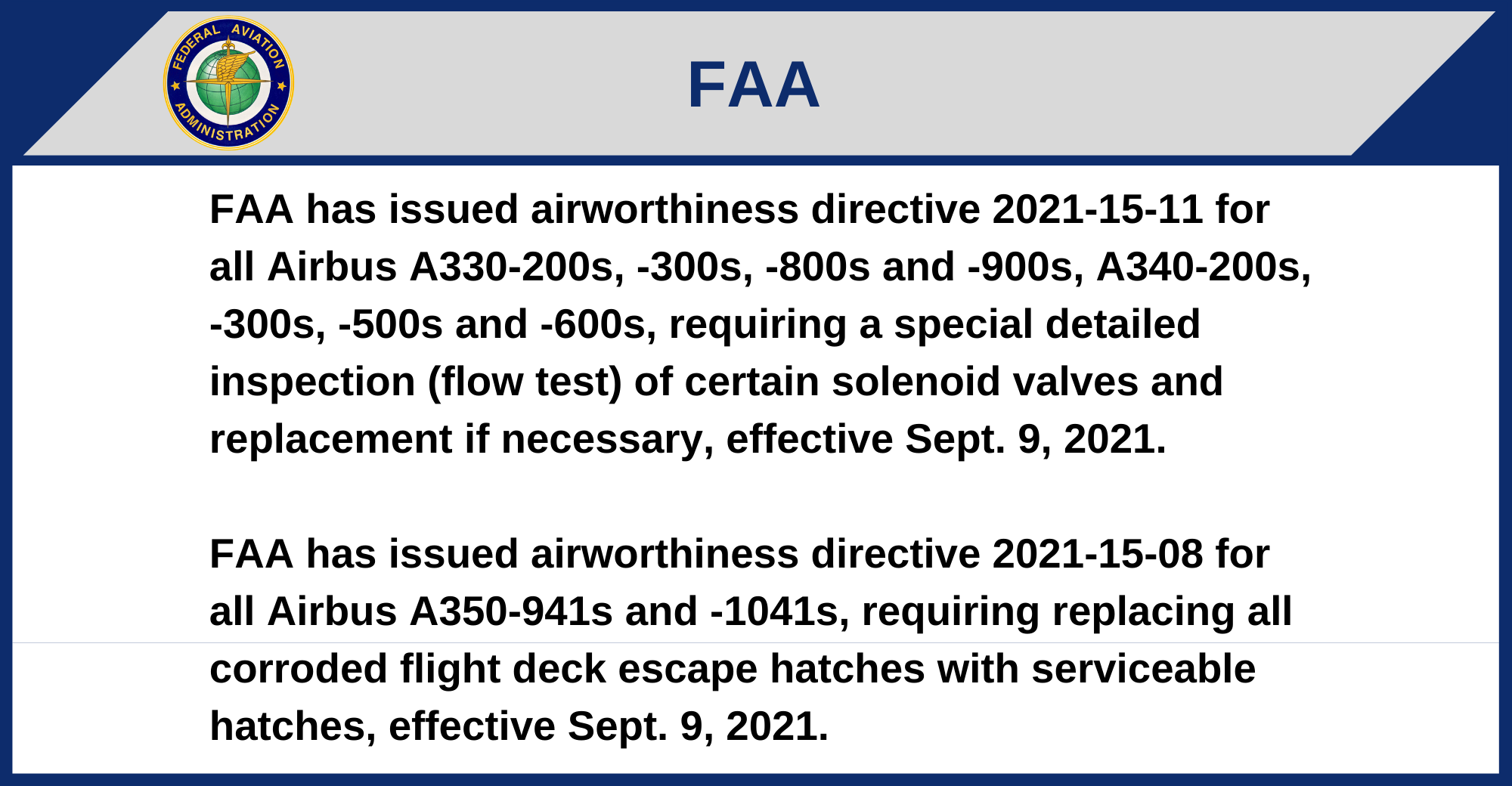 FAA has issued airworthiness directive 2021-15-08 for all Airbus A350-941s and -1041s, requiring replacing all corroded flight deck escape hatches with serviceable hatches, effective Sept. 9, 2021.