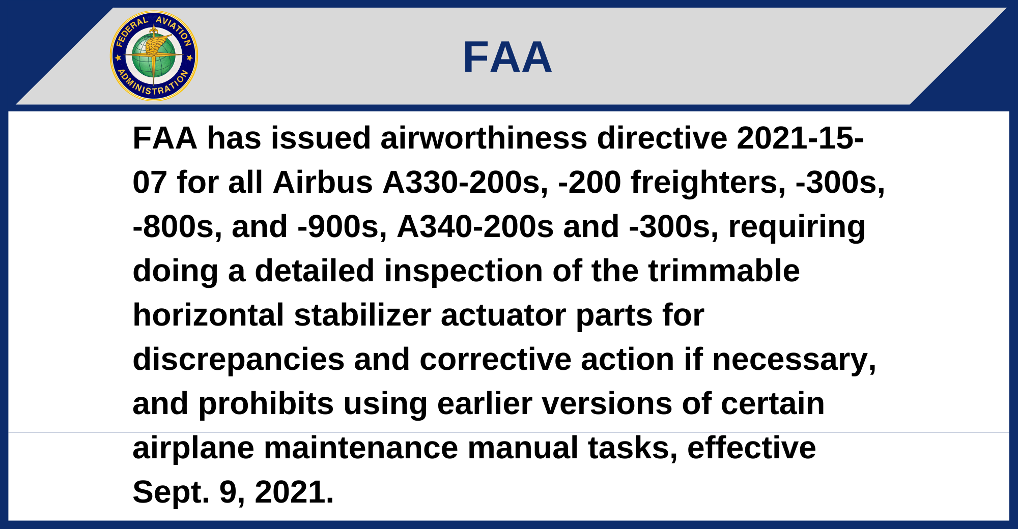 FAA has issued airworthiness directive 2021-15-07 for all Airbus A330-200s, -200 freighters, -300s, -800s, and -900s, A340-200s and -300s, requiring doing a detailed inspection of the trimmable horizontal stabilizer actuator parts for discrepancies and corrective action if necessary, and prohibits using earlier versions of certain airplane maintenance manual tasks, effective Sept. 9, 2021.
