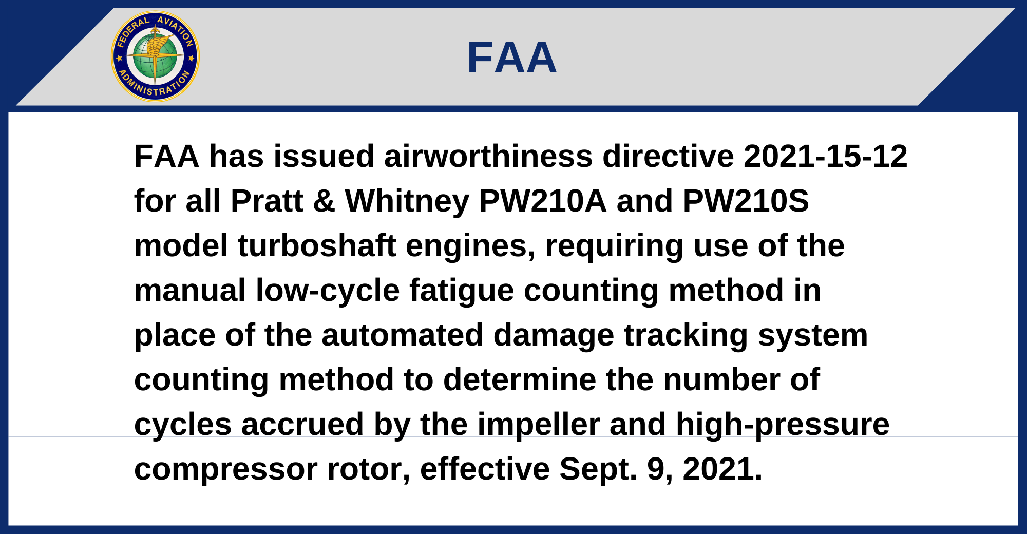 FAA has issued airworthiness directive 2021-15-12 for all Pratt & Whitney PW210A and PW210S model turboshaft engines, requiring use of the manual low-cycle fatigue counting method in place of the automated damage tracking system counting method to determine the number of cycles accrued by the impeller and high-pressure compressor rotor, effective Sept. 9, 2021.