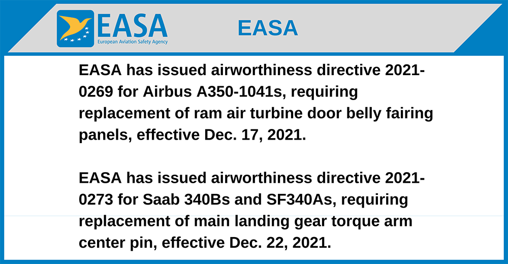 EASA has issued airworthiness directive 2021-0269 for Airbus A350-1041s, requiring replacement of ram air turbine door belly fairing panels, effective Dec. 17, 2021.