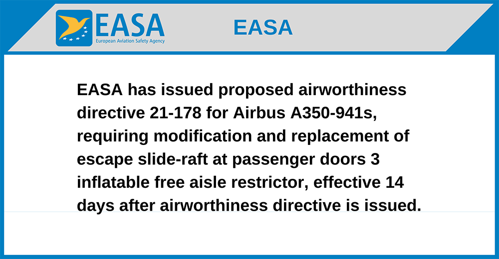 EASA has issued proposed airworthiness directive 21-178 for Airbus A350-941s, requiring modification and replacement of escape slide-raft at passenger doors 3 inflatable free aisle restrictor, effective 14 days after airworthiness directive is issued.
