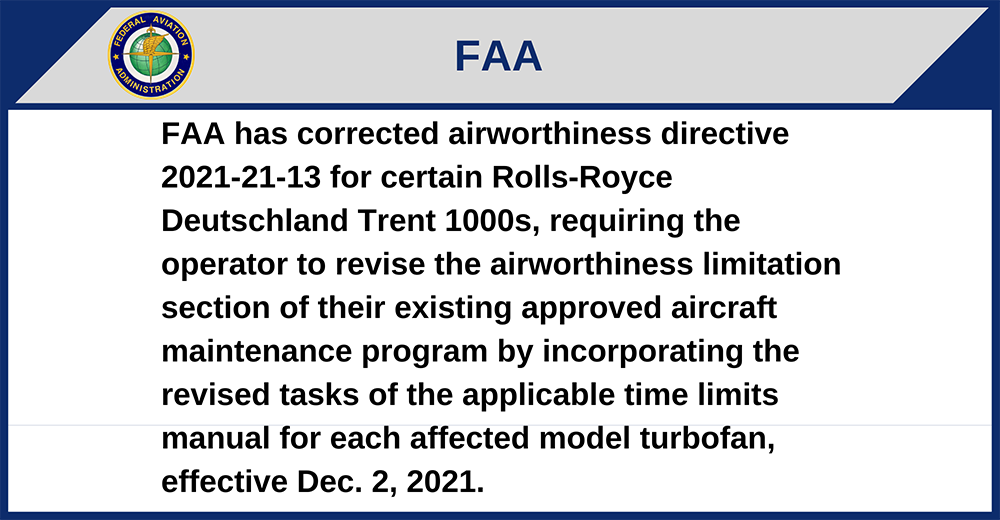 FAA has corrected airworthiness directive 2021-21-13 for certain Rolls-Royce Deutschland Trent 1000s, requiring the operator to revise the airworthiness limitation section of their existing approved aircraft maintenance program by incorporating the revised tasks of the applicable time limits manual for each affected model turbofan, effective Dec. 2, 2021.