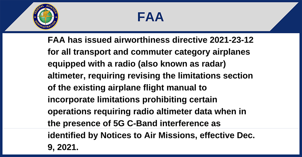 FAA has issued airworthiness directive 2021-23-12 for all transport and commuter category airplanes equipped with a radio (also known as radar) altimeter, requiring revising the limitations section of the existing airplane flight manual to incorporate limitations prohibiting certain operations requiring radio altimeter data when in the presence of 5G C-Band interference as identified by Notices to Air Missions, effective Dec. 9, 2021.