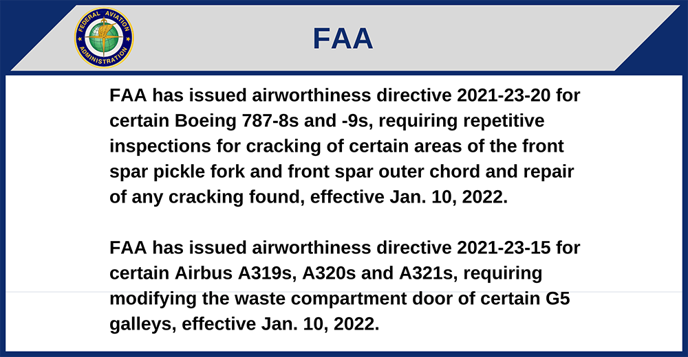 FAA has issued airworthiness directive 2021-23-20 for certain Boeing 787-8s and -9s, requiring repetitive inspections for cracking of certain areas of the front spar pickle fork and front spar outer chord and repair of any cracking found, effective Jan. 10, 2022.