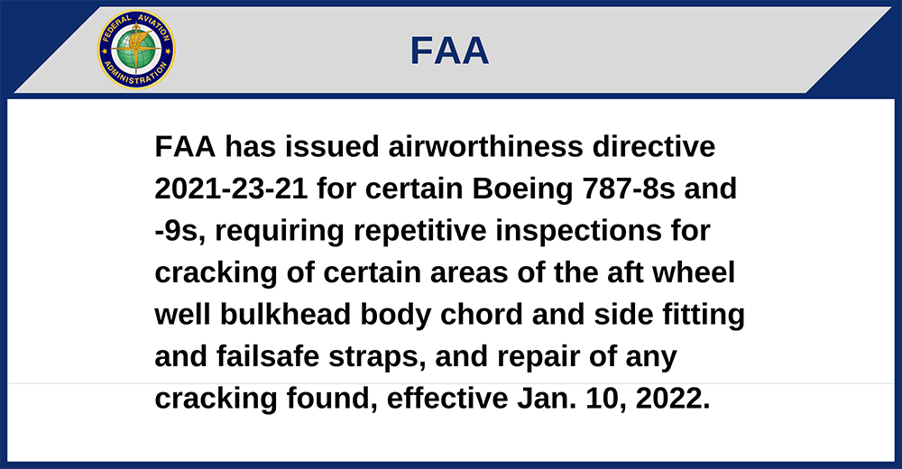 FAA has issued airworthiness directive 2021-23-21 for certain Boeing 787-8s and -9s, requiring repetitive inspections for cracking of certain areas of the aft wheel well bulkhead body chord and side fitting and failsafe straps, and repair of any cracking found, effective Jan. 10, 2022.