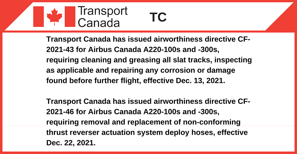 Transport Canada has issued airworthiness directive CF-2021-43 for Airbus Canada A220-100s and -300s, requiring cleaning and greasing all slat tracks, inspecting as applicable and repairing any corrosion or damage found before further flight, effective Dec. 13, 2021.