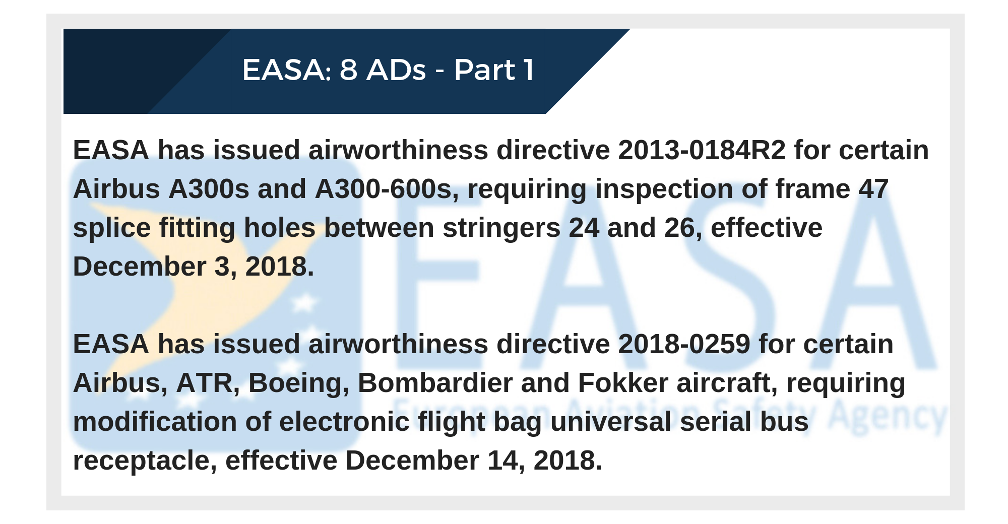 EASA has issued airworthiness directive 2013-0184R2 for certain Airbus A300s and A300-600s, requiring inspection of frame 47 splice fitting holes between stringers 24 and 26, effective December 3, 2018.