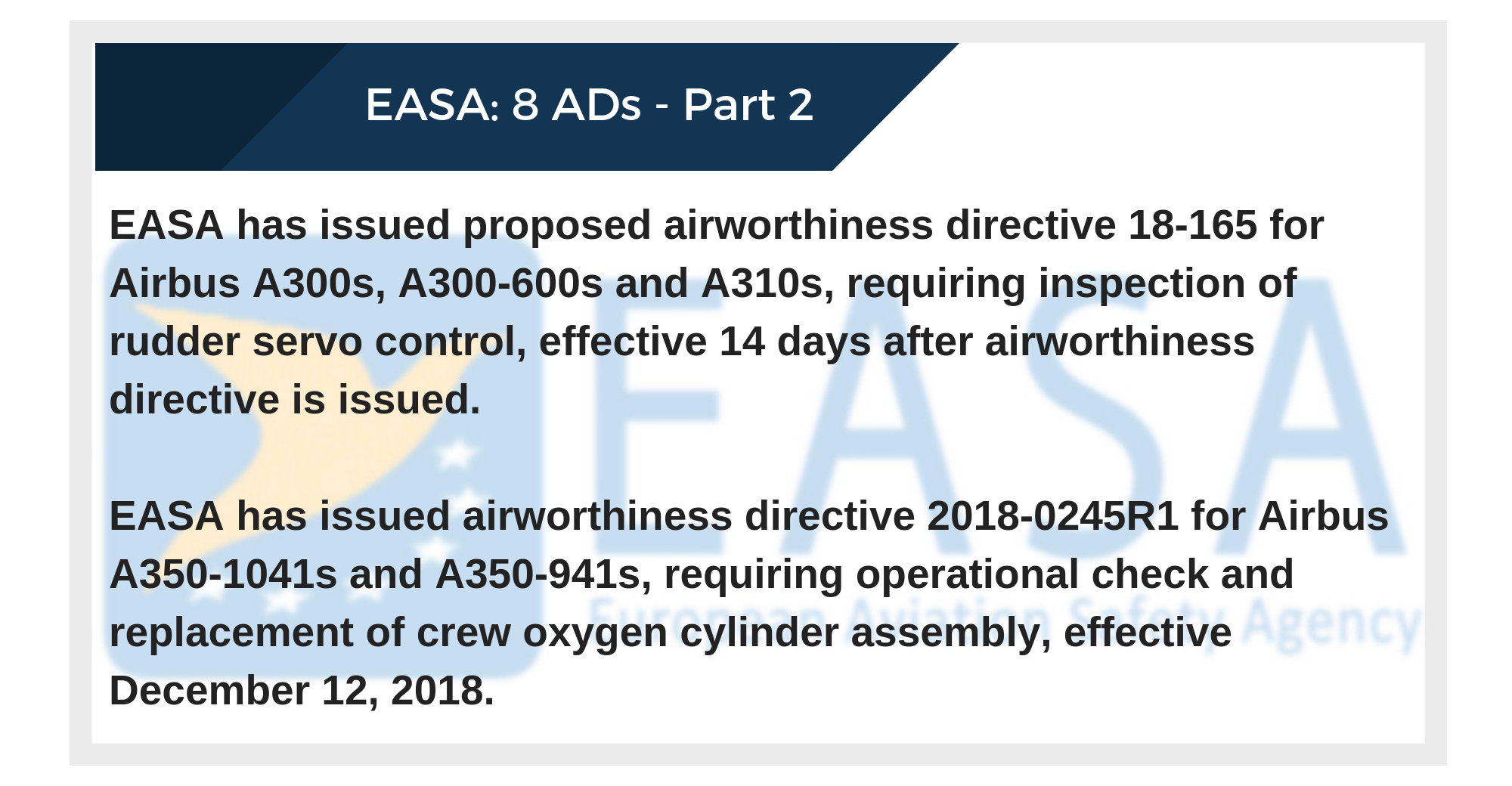 EASA has issued airworthiness directive 2018-0245R1 for Airbus A350-1041s and A350-941s, requiring operational check and replacement of crew oxygen cylinder assembly, effective December 12, 2018.