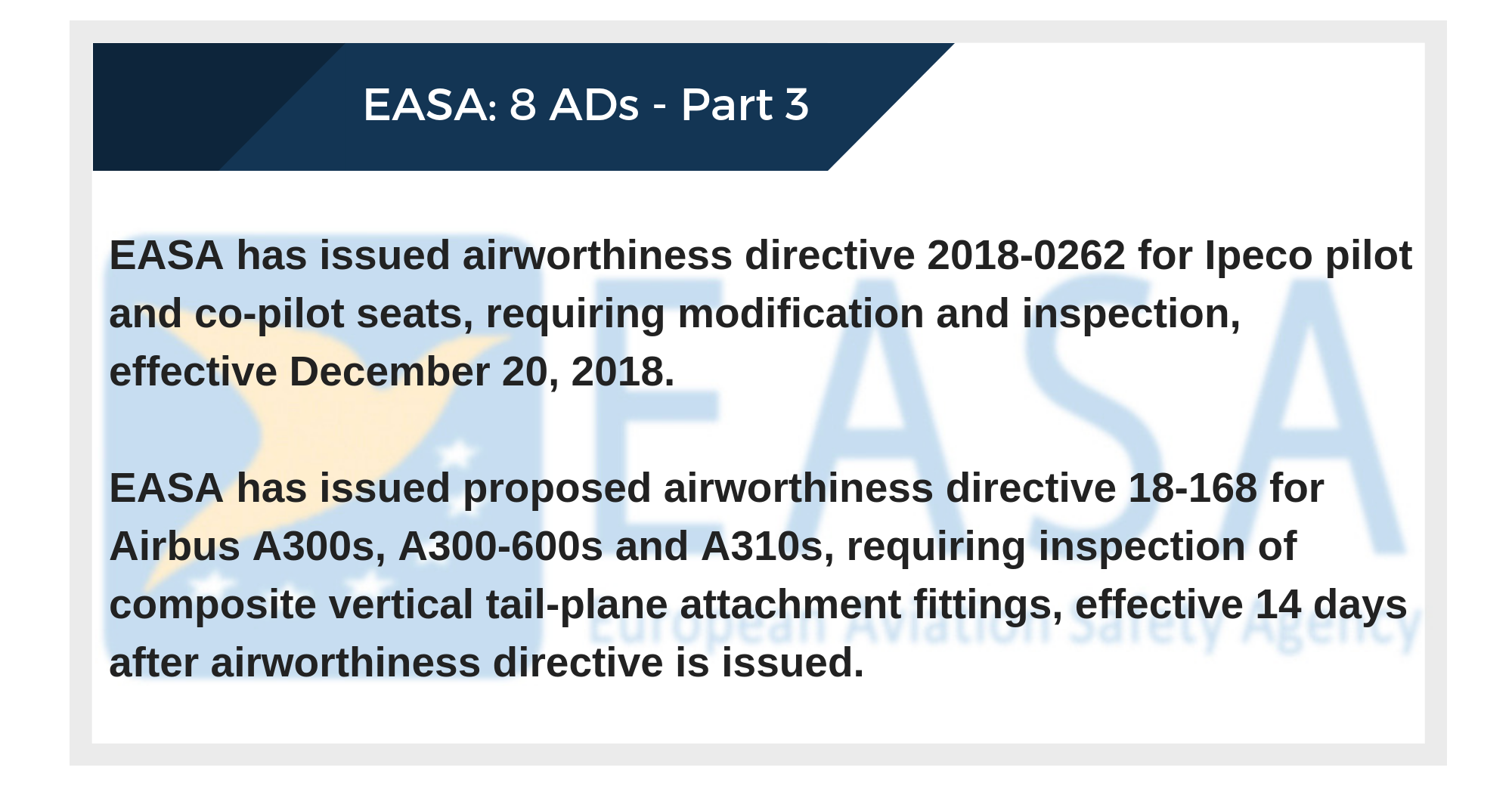 EASA has issued proposed airworthiness directive 18-168 for Airbus A300s, A300-600s and A310s, requiring inspection of composite vertical tail-plane attachment fittings, effective 14 days after airworthiness directive is issued.
