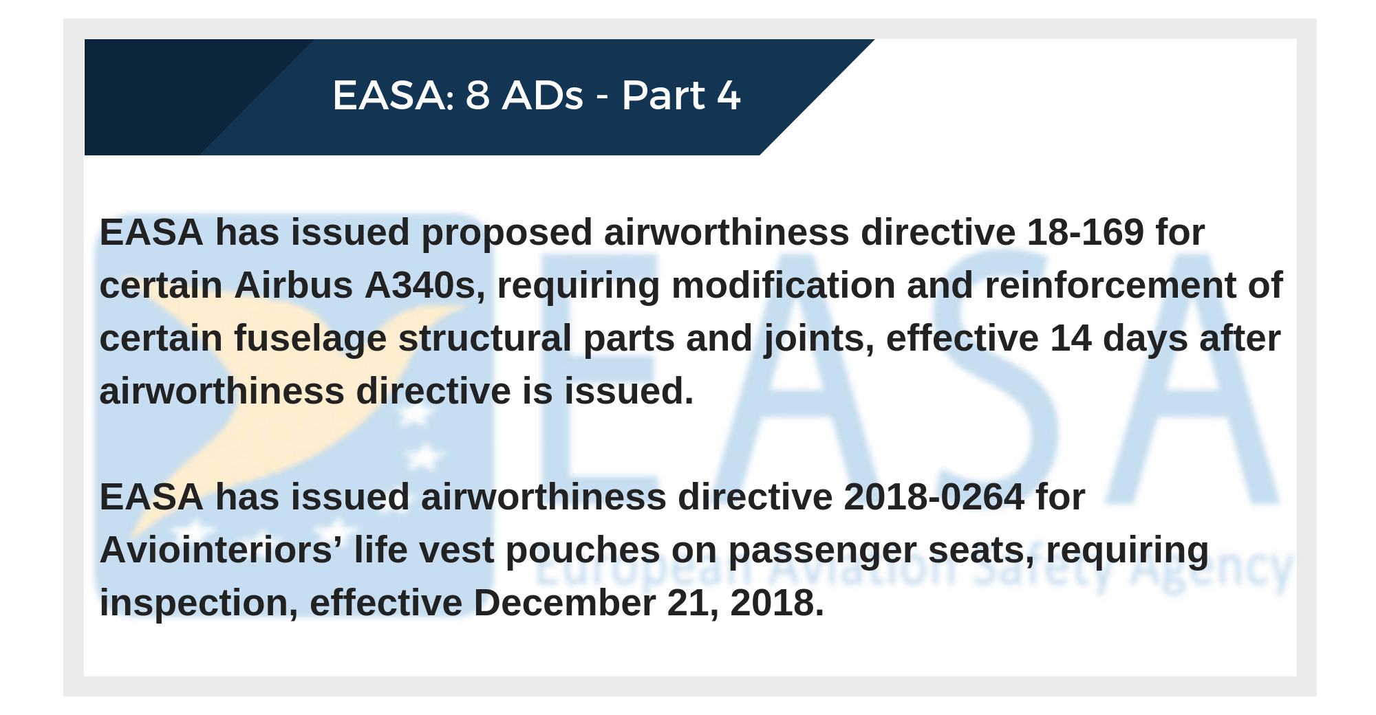 EASA has issued airworthiness directive 2018-0264 for Aviointeriors’ life vest pouches on passenger seats, requiring inspection, effective December 21, 2018.