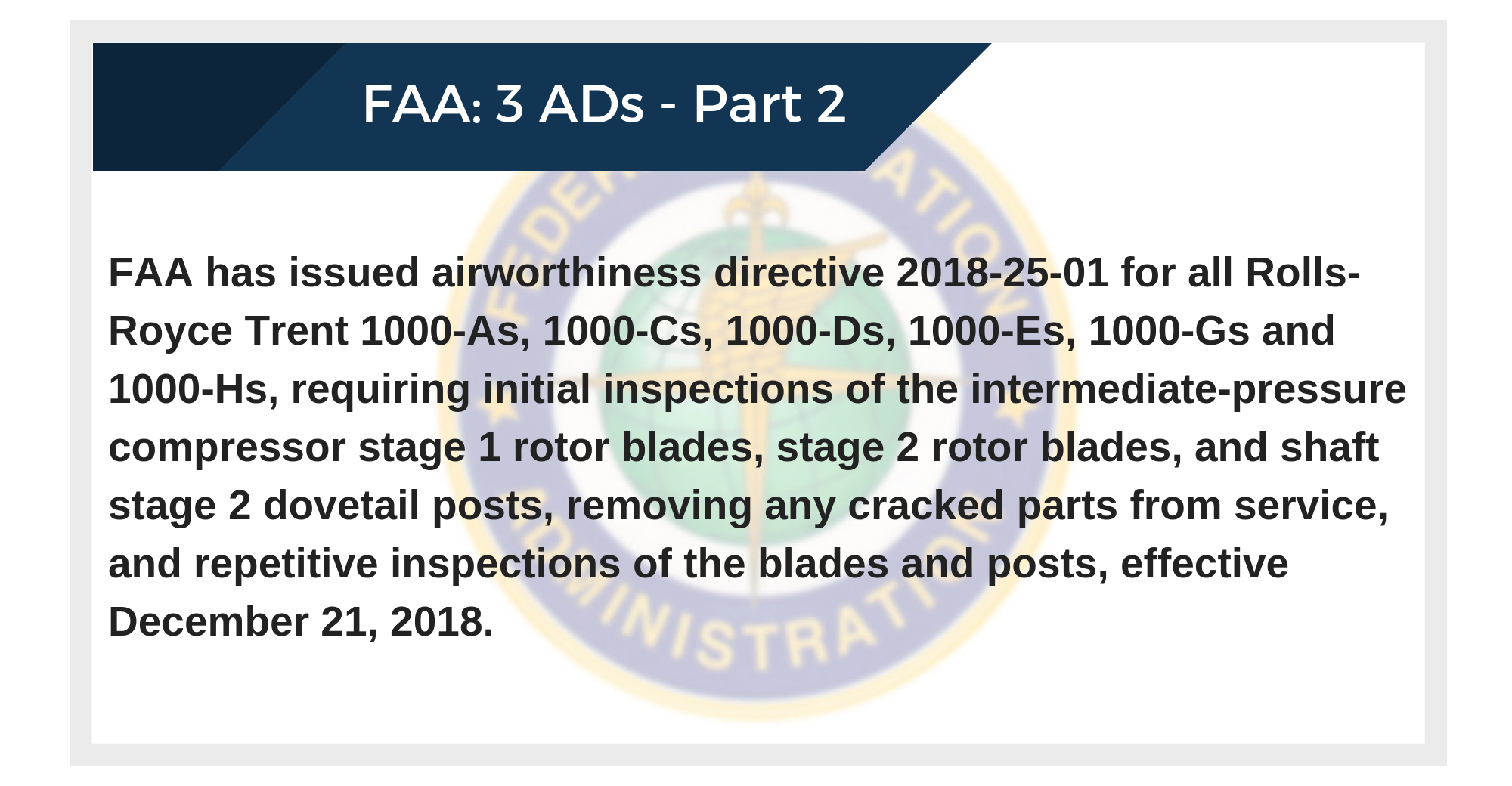 FAA has issued airworthiness directive 2018-25-01 for all Rolls-Royce Trent 1000-As, 1000-Cs, 1000-Ds, 1000-Es, 1000-Gs and 1000-Hs, requiring initial inspections of the intermediate-pressure compressor stage 1 rotor blades, stage 2 rotor blades, and shaft stage 2 dovetail posts, removing any cracked parts from service, and repetitive inspections of the blades and posts, effective December 21, 2018.