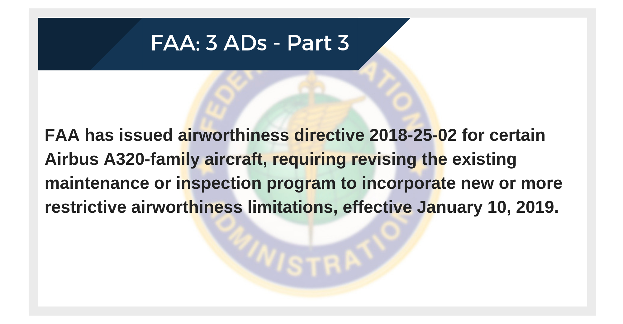 FAA has issued airworthiness directive 2018-25-02 for certain Airbus A320-family aircraft, requiring revising the existing maintenance or inspection program to incorporate new or more restrictive airworthiness limitations, effective January 10, 2019.