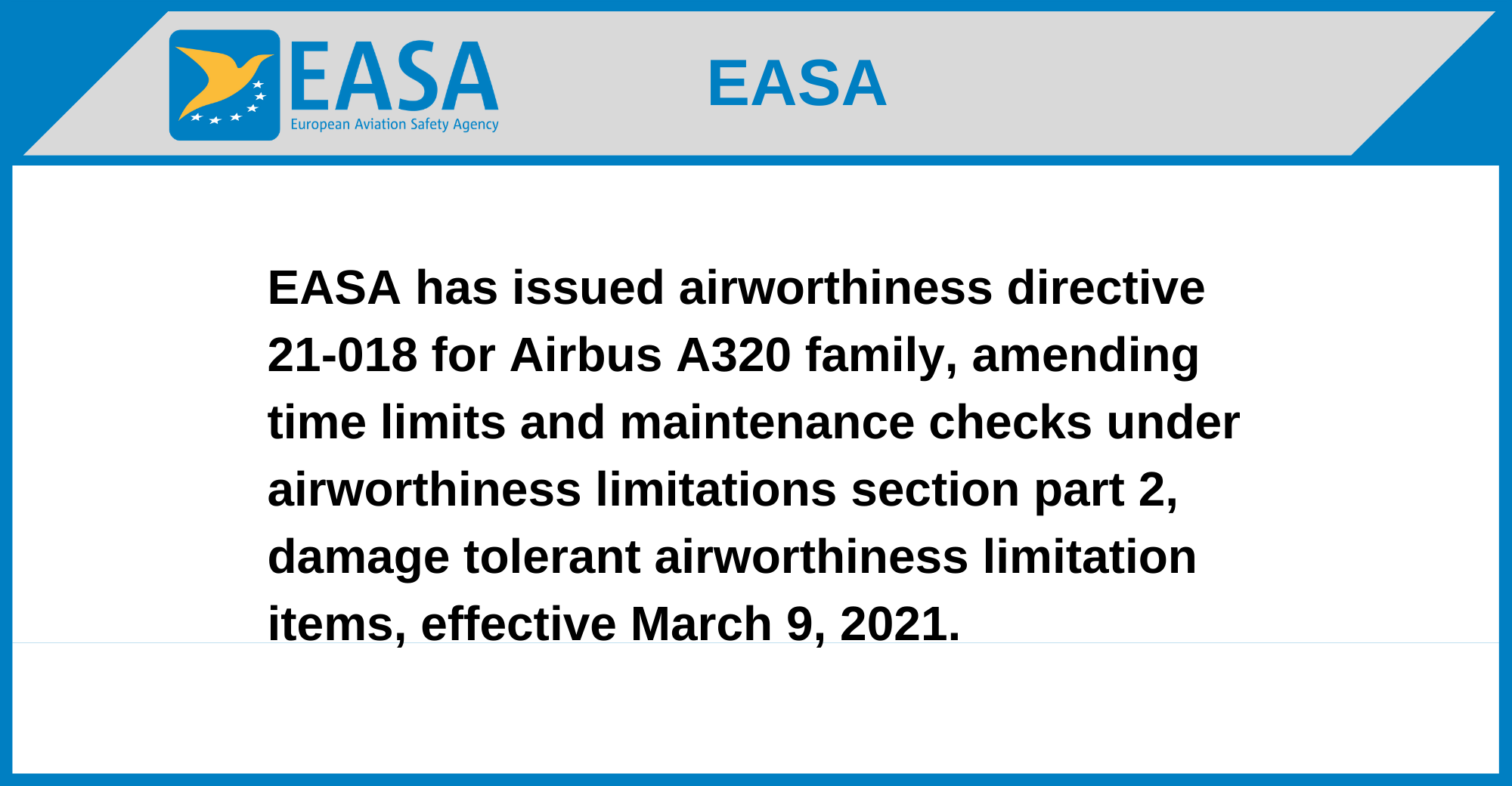 EASA has issued airworthiness directive 21-018 for Airbus A320 family, amending time limits and maintenance checks under airworthiness limitations section part 2, damage tolerant airworthiness limitation items, effective March 9, 2021.