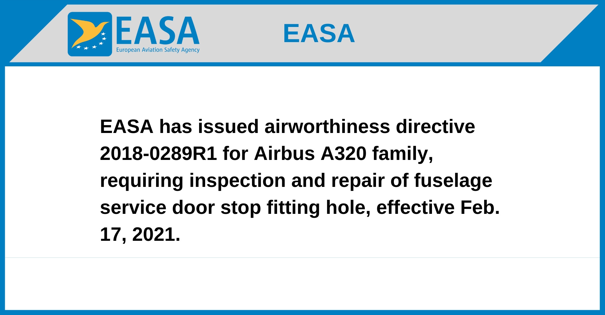 EASA has issued airworthiness directive 2018-0289R1 for Airbus A320 family, requiring inspection and repair of fuselage service door stop fitting hole, effective Feb. 17, 2021.