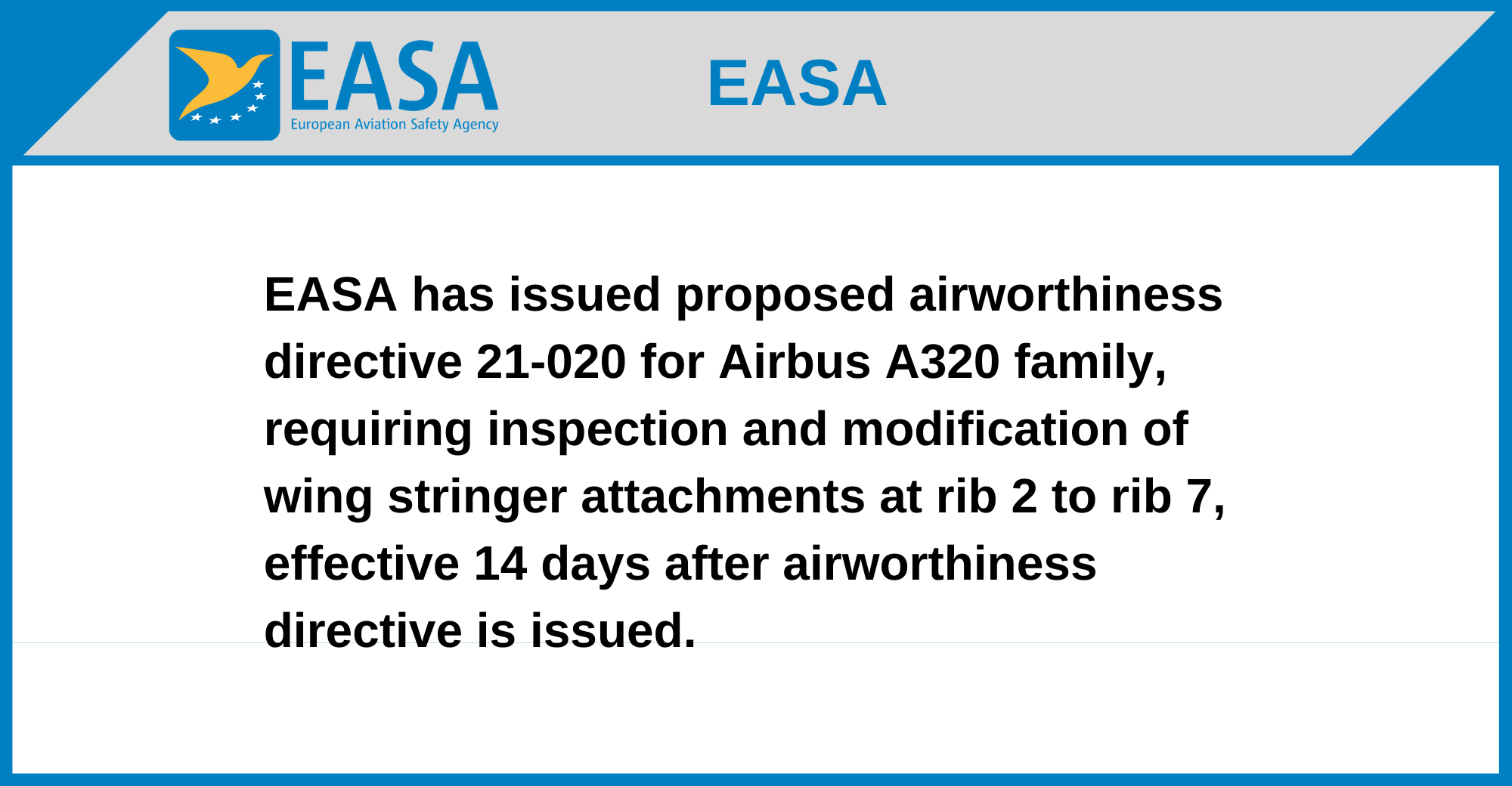 EASA has issued proposed airworthiness directive 21-020 for Airbus A320 family, requiring inspection and modification of wing stringer attachments at rib 2 to rib 7, effective 14 days after airworthiness directive is issued.