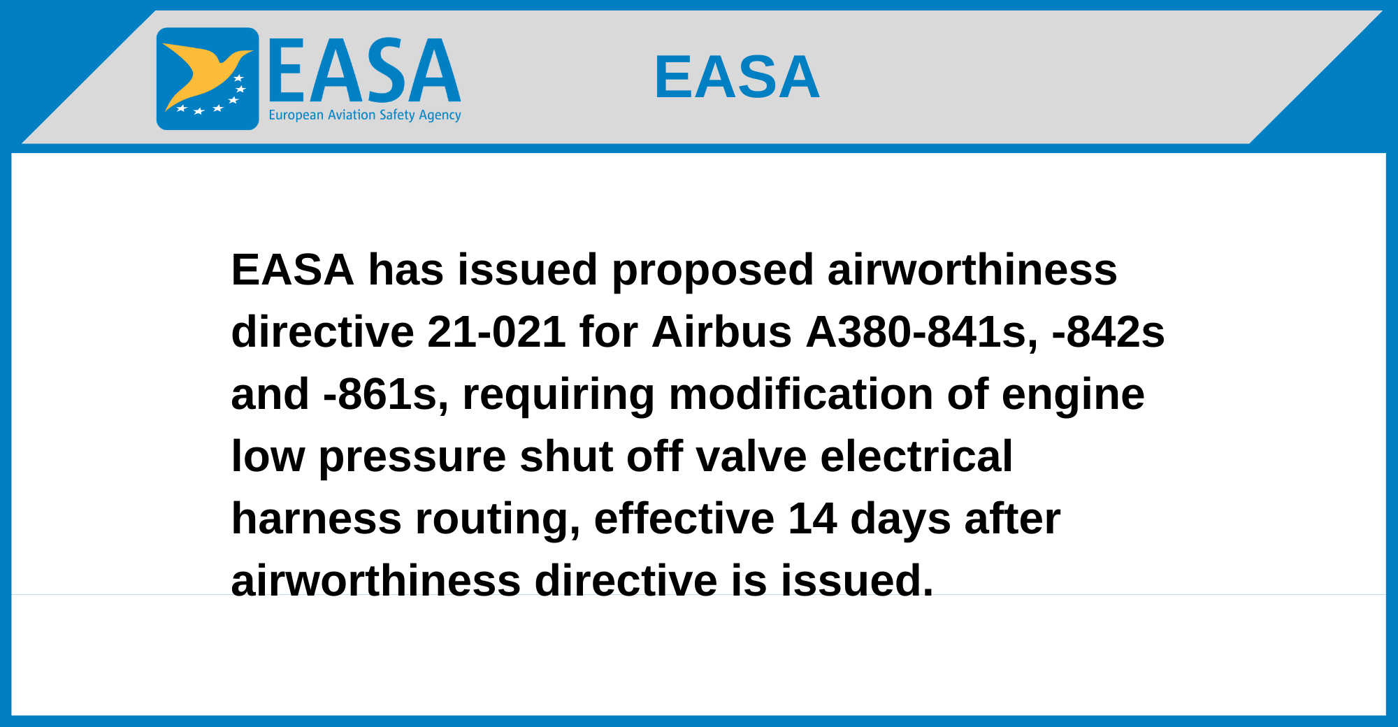 EASA has issued proposed airworthiness directive 21-021 for Airbus A380-841s, -842s and -861s, requiring modification of engine low-pressure shut off valve electrical harness routing, effective 14 days after airworthiness directive is issued.