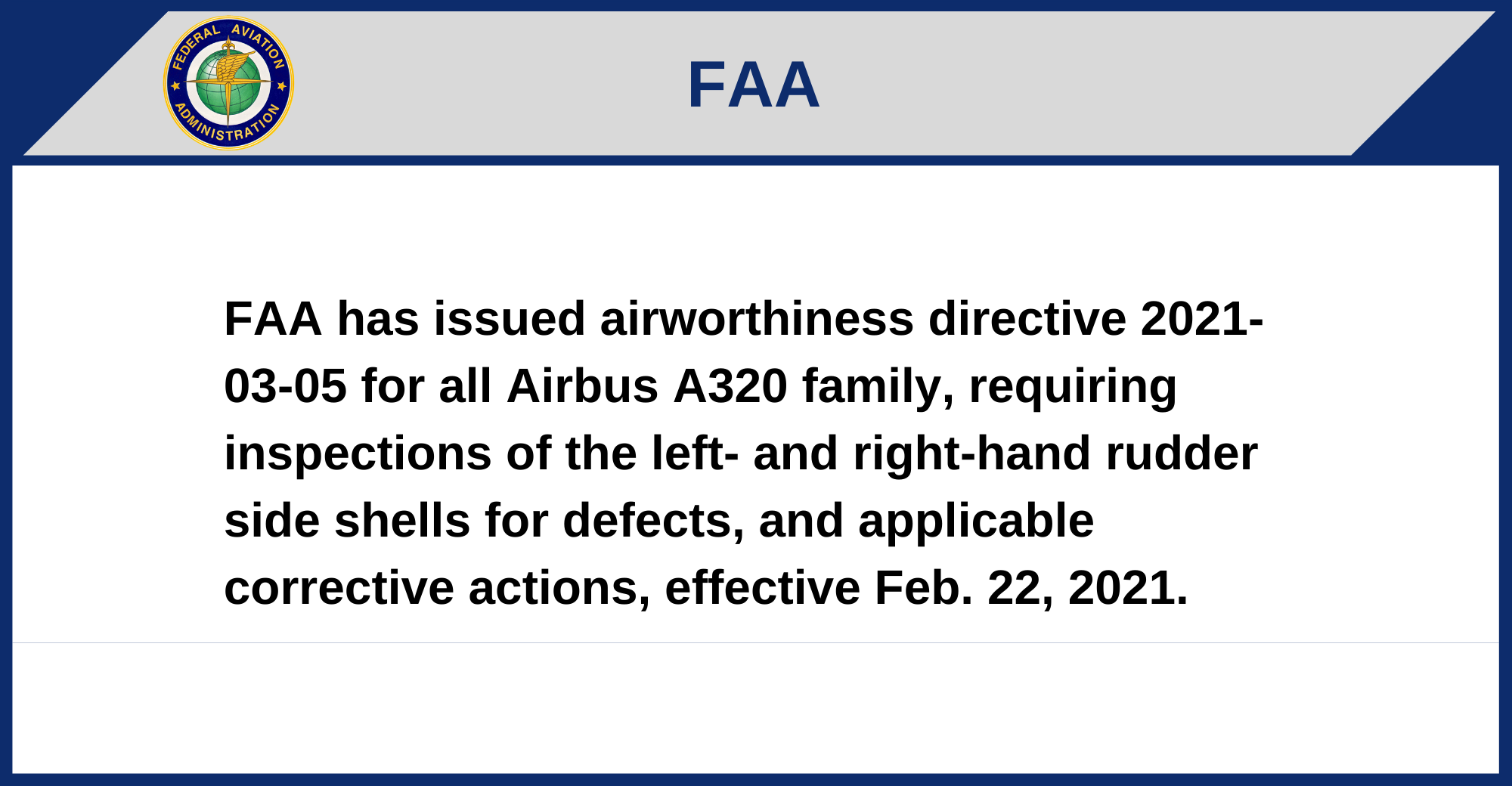 FAA has issued airworthiness directive 2021-03-05 for all Airbus A320 family, requiring inspections of the left- and right-hand rudder side shells for defects, and applicable corrective actions, effective Feb. 22, 2021.