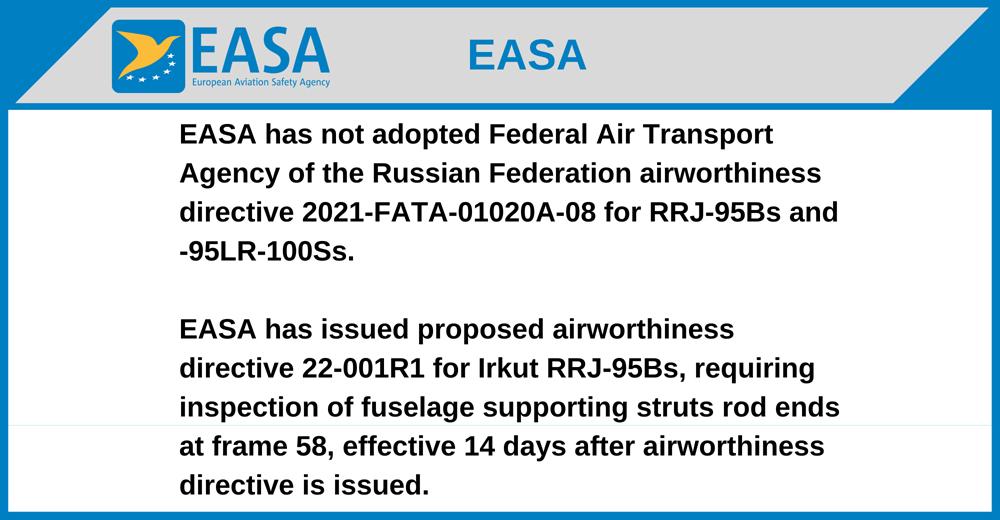 EASA has issued proposed airworthiness directive 22-001R1 for Irkut RRJ-95Bs, requiring inspection of fuselage supporting struts rod ends at frame 58, effective 14 days after airworthiness directive is issued.