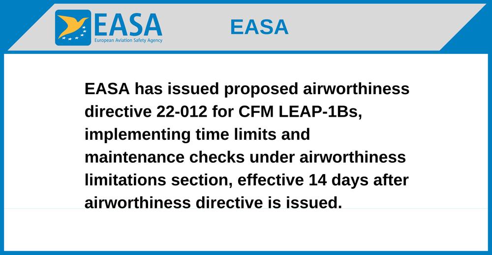 EASA has issued proposed airworthiness directive 22-012 for CFM LEAP-1Bs, implementing time limits and maintenance checks under airworthiness limitations section, effective 14 days after airworthiness directive is issued.