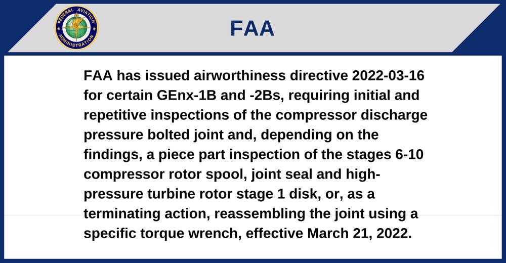 FAA has issued airworthiness directive 2022-03-16 for certain GEnx-1B and -2Bs, requiring initial and repetitive inspections of the compressor discharge pressure bolted joint and, depending on the findings, a piece part inspection of the stages 6-10 compressor rotor spool, joint seal and high-pressure turbine rotor stage 1 disk, or, as a terminating action, reassembling the joint using a specific torque wrench, effective March 21, 2022.