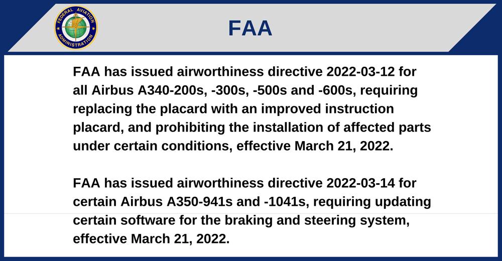FAA has issued airworthiness directive 2022-03-14 for certain Airbus A350-941s and -1041s, requiring updating certain software for the braking and steering system, effective March 21, 2022.