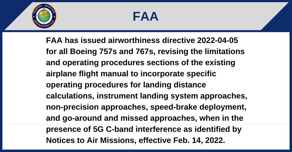 FAA has issued airworthiness directive 2022-04-05 for all Boeing 757s and 767s, revising the limitations and operating procedures sections of the existing airplane flight manual to incorporate specific operating procedures for landing distance calculations, instrument landing system approaches, non-precision approaches, speed-brake deployment, and go-around and missed approaches, when in the presence of 5G C-band interference as identified by Notices to Air Missions, effective Feb. 14, 2022.