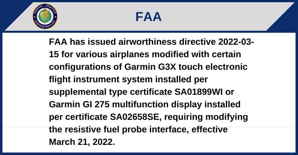 FAA has issued airworthiness directive 2022-03-15 for various airplanes modified with certain configurations of Garmin G3X touch electronic flight instrument system installed per supplemental type certificate SA01899WI or Garmin GI 275 multifunction display installed per certificate SA02658SE, requiring modifying the resistive fuel probe interface, effective March 21, 2022.