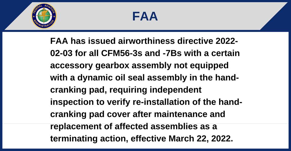 FAA has issued airworthiness directive 2022-02-03 for all CFM56-3s and -7Bs with a certain accessory gearbox assembly not equipped with a dynamic oil seal assembly in the hand-cranking pad, requiring independent inspection to verify re-installation of the hand-cranking pad cover after maintenance and replacement of affected assemblies as a terminating action, effective March 22, 2022.