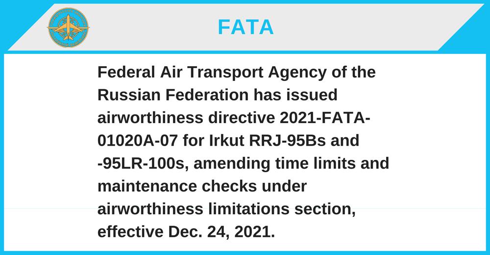 Federal Air Transport Agency of the Russian Federation has issued airworthiness directive 2021-FATA-01020A-07 for Irkut RRJ-95Bs and -95LR-100s, amending time limits and maintenance checks under airworthiness limitations section, effective Dec. 24, 2021.